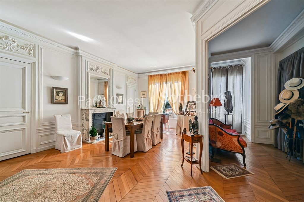 With north-south exposure this apartment161 m² (about 1731 ft²), built in 1913, in a building of 7 floors has 5 rooms including 3 bedrooms, 1 bathroom and 2 toilets. It has a living room, dining room 28.84 m² (about 310 ft²), a Separate kitchen and a cellar14 m² (about 150 ft²). It's located on the 5th floor with a lift. Heating : Collective gaz radiator. Others : intercom, digicode, guard, parquet floor, fireplace. This text is an automatic translation.