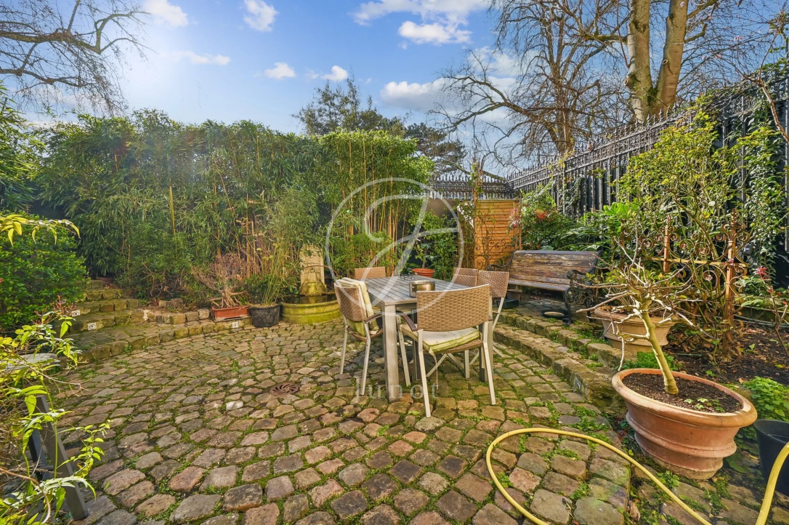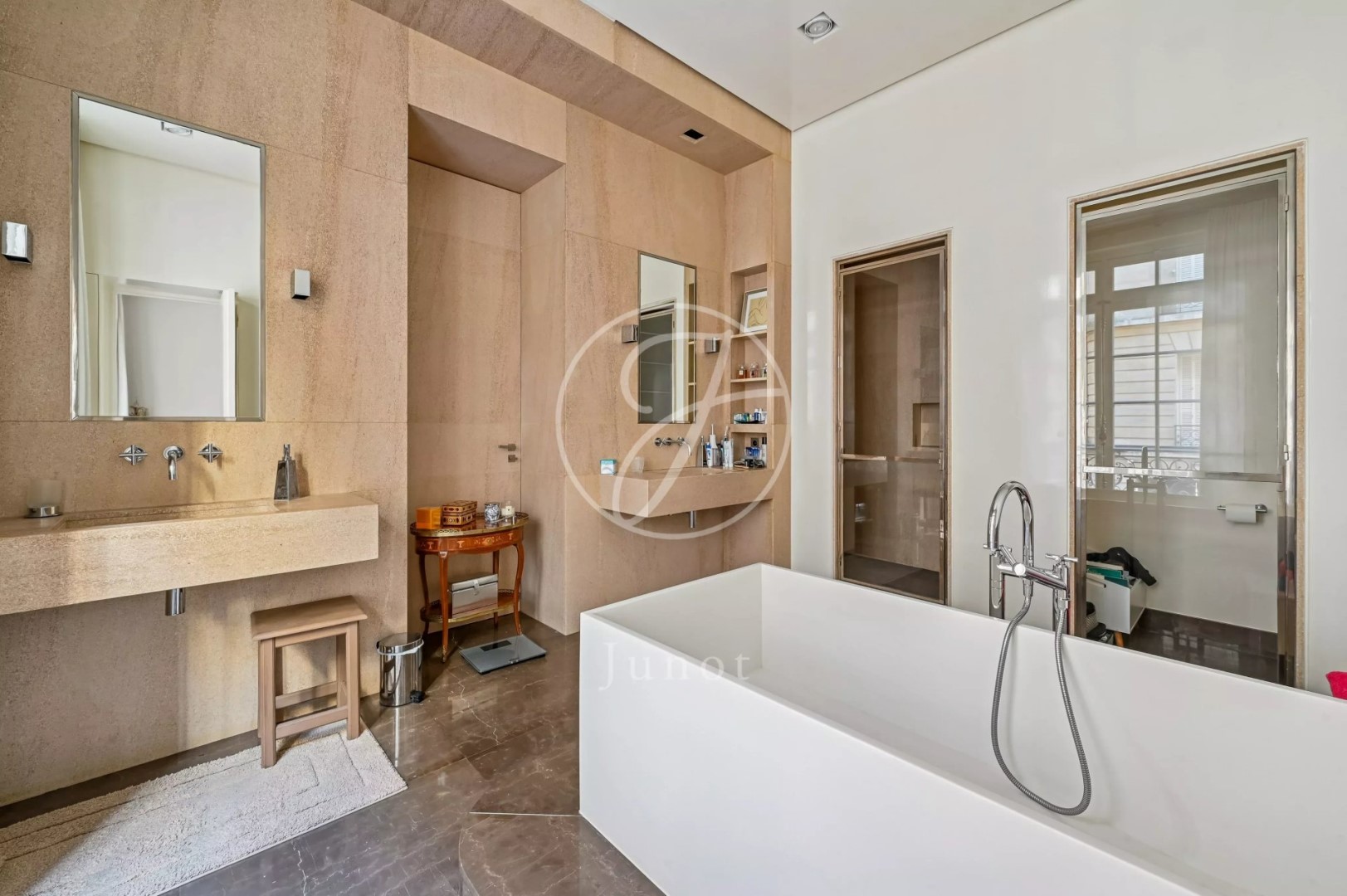 In a beautiful Haussmannian building on Avenue Foch, this exceptional 240.64 sq m (Carrez Law) apartment has been completely redesigned by architect Pierre Yovanovitch. The entrance opens onto an elegant gallery leading to a spacious, light-filled living room with unobstructed views of the avenue's trees. A separate dining room and an office complete the reception areas. The furniture in the living room and dining room, as well as the headboards, are by Maison Bentley, lending the entire apartment a particularly high-end feel. The sleeping area comprises three suites. The master suite features a dressing room and a bathroom. The two other bedrooms each have their own shower room. One of them, accessible via a service entrance, offers welcome privacy. On the lower level, a spacious eat-in kitchen opens onto a private landscaped garden designed by Camille Muller, offering complete privacy. The apartment benefits from full soundproofing and quadruple-glazed windows. It features central gas heating and individual hot water. A rare property combining period charm with top-of-the-range contemporary amenities.