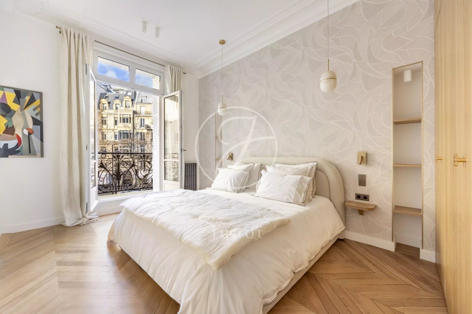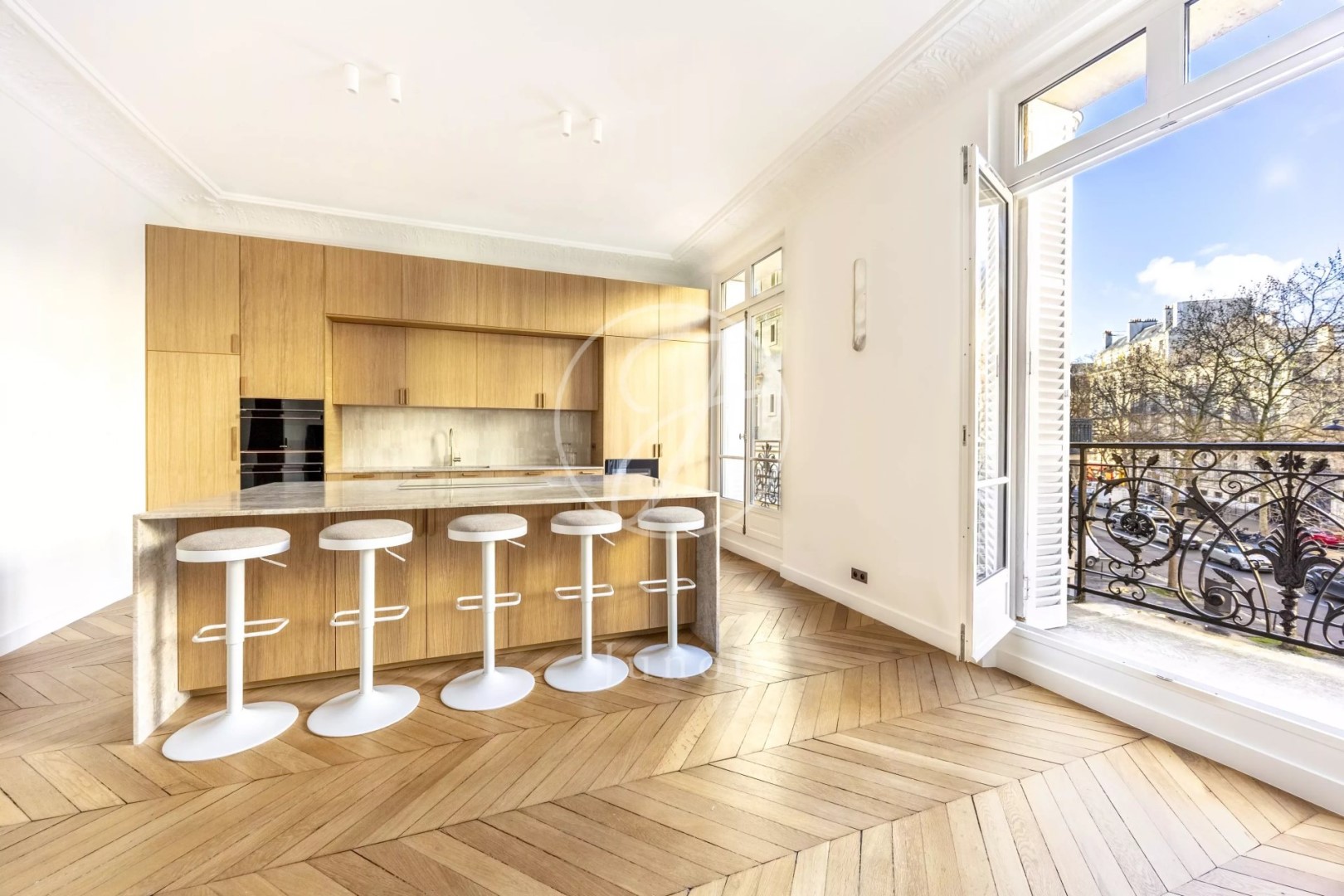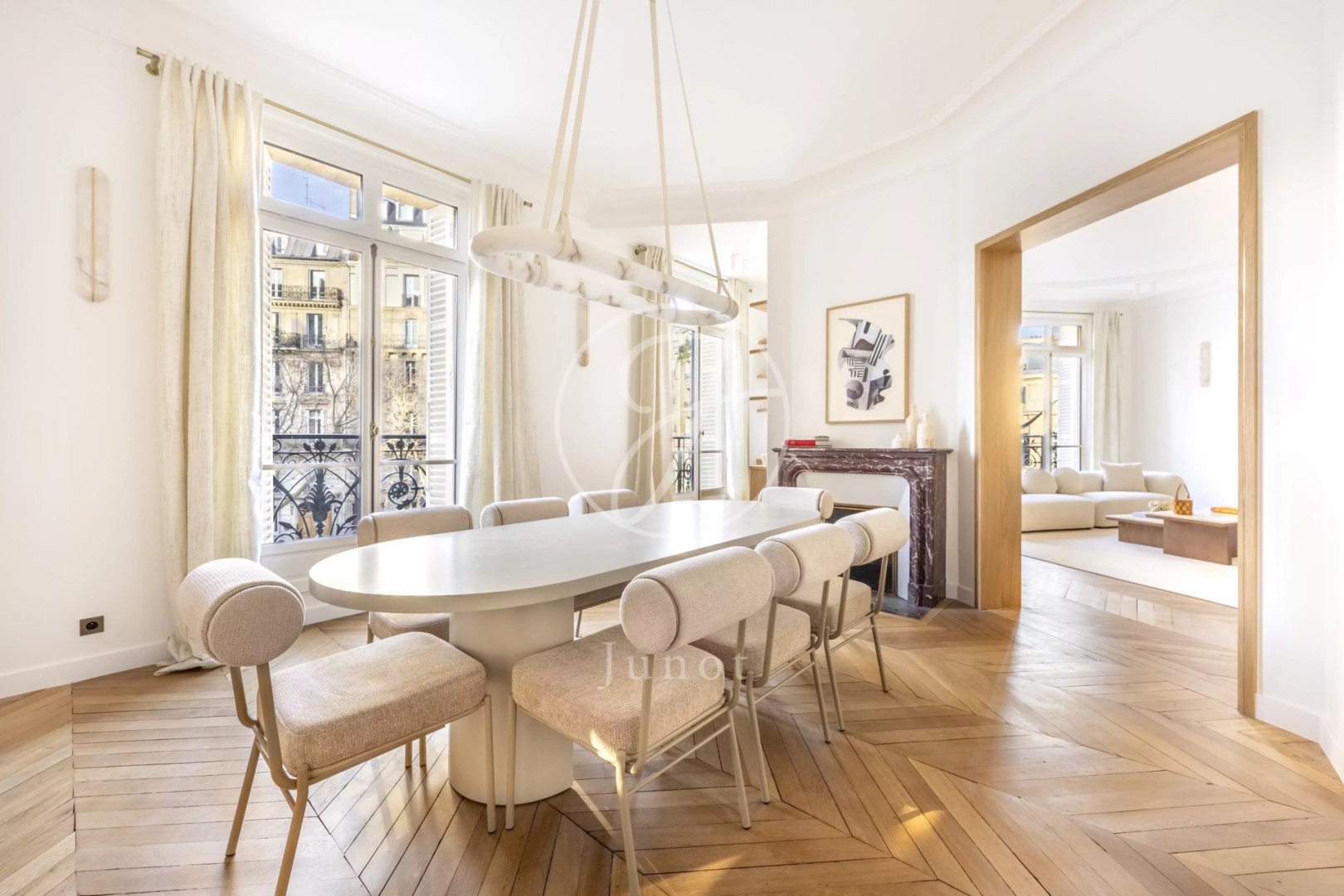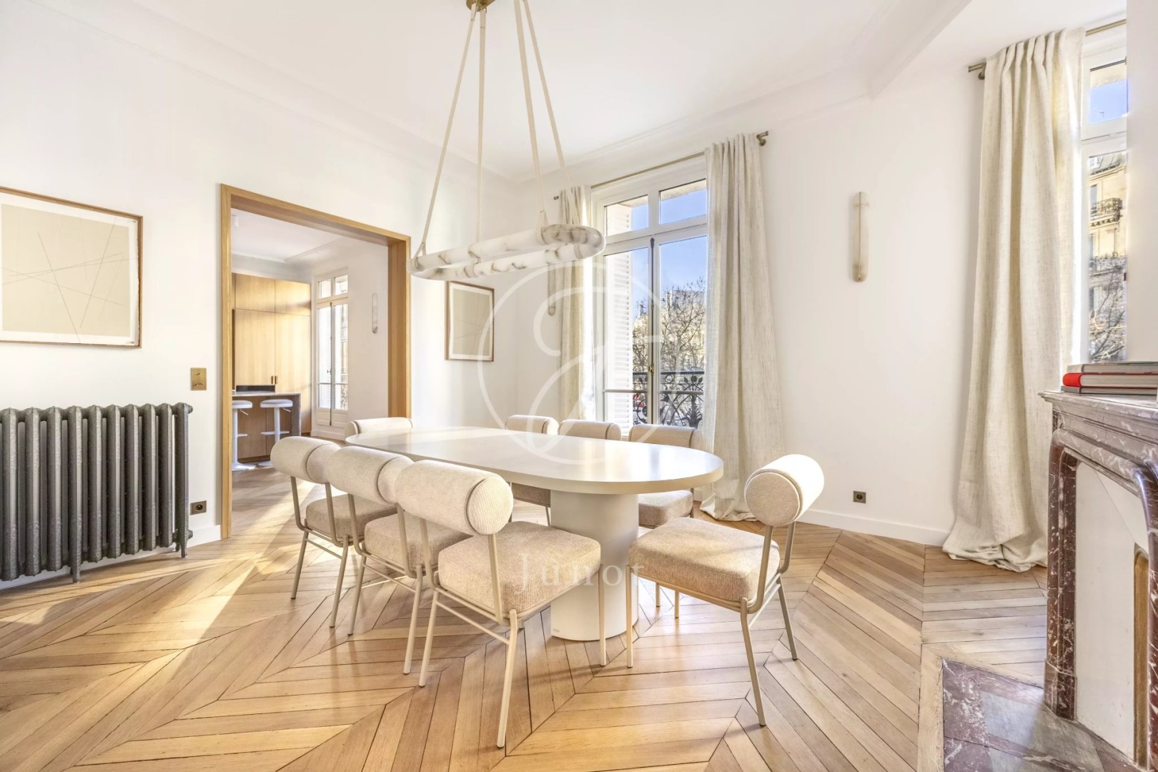 Just steps from the Trocadéro, in a prestigious Haussmannian building, this 202.30 sq m (Carrez Law) apartment is located on the second floor (with elevator) and is fully air-conditioned. Luxuriously renovated by an architect, it features balconies with views of the Eiffel Tower and Arc de Triomphe. Bright and airy, it comprises an entrance hall, a spacious, open-plan reception area with high ceilings and abundant natural light, including a living room, dining room, and eat-in kitchen, a master suite with dressing room and bathroom, three further en suite bedrooms, each with its own bathroom, and a laundry room. A cellar completes this exceptional property, which is sold furnished.