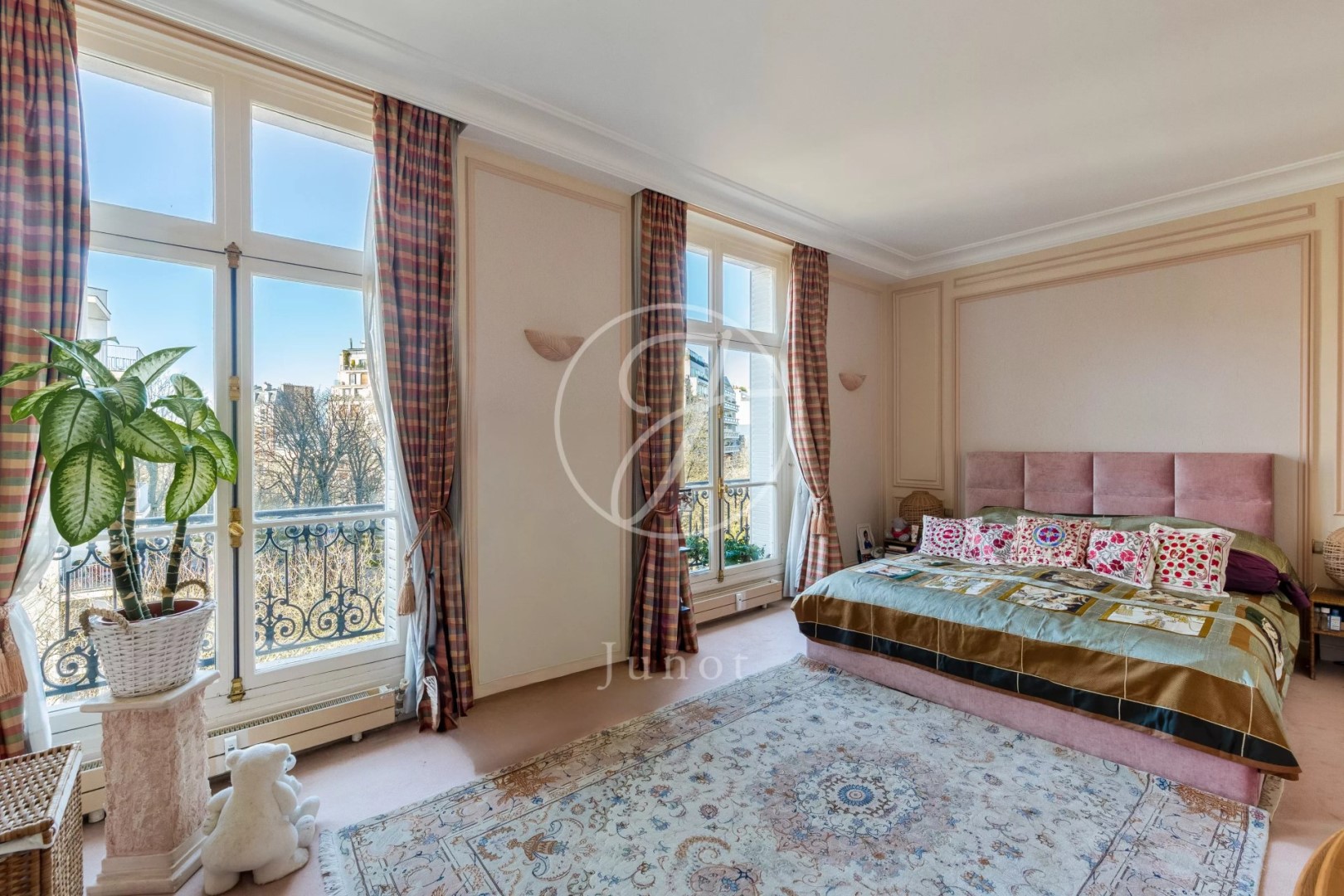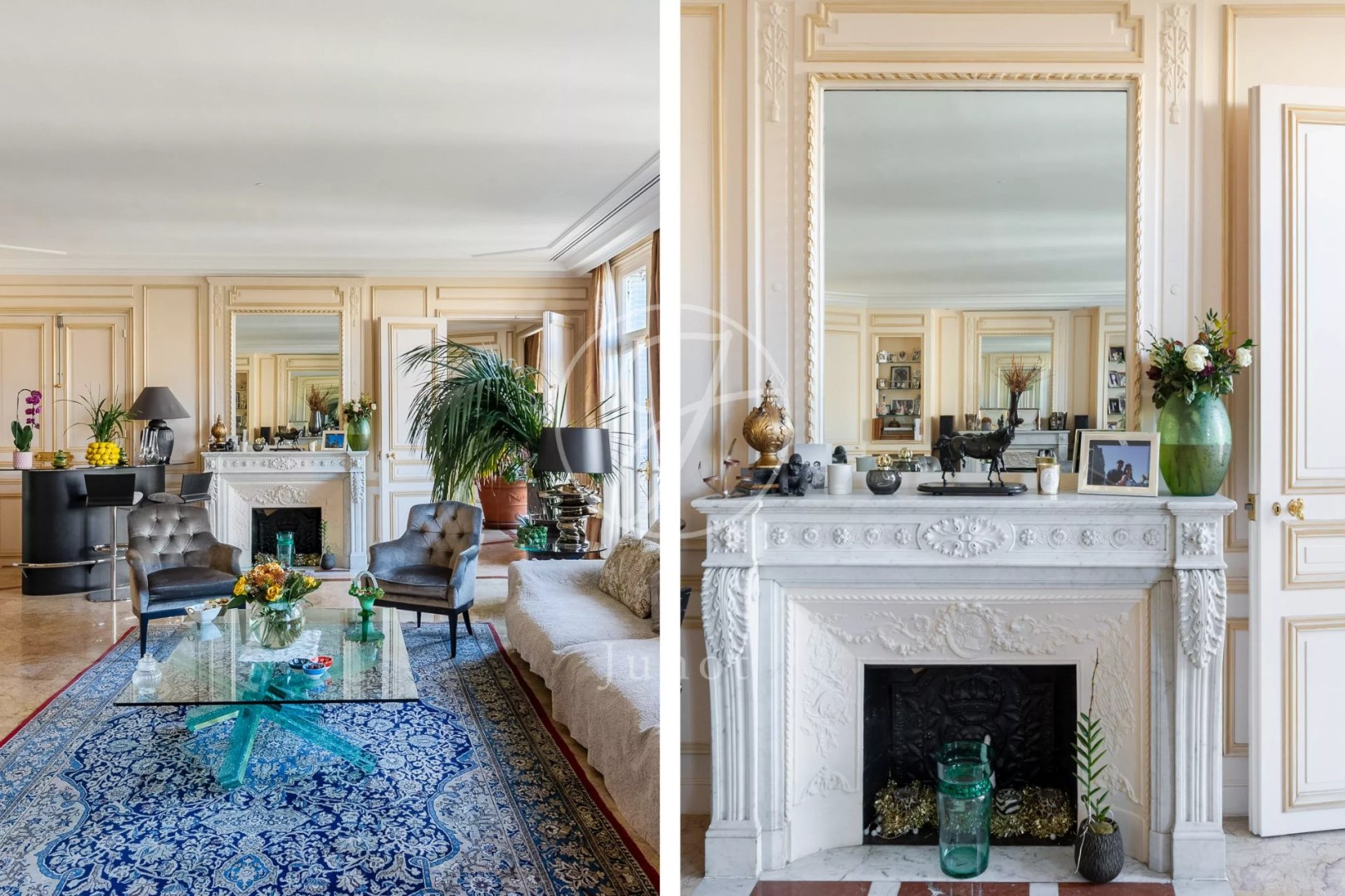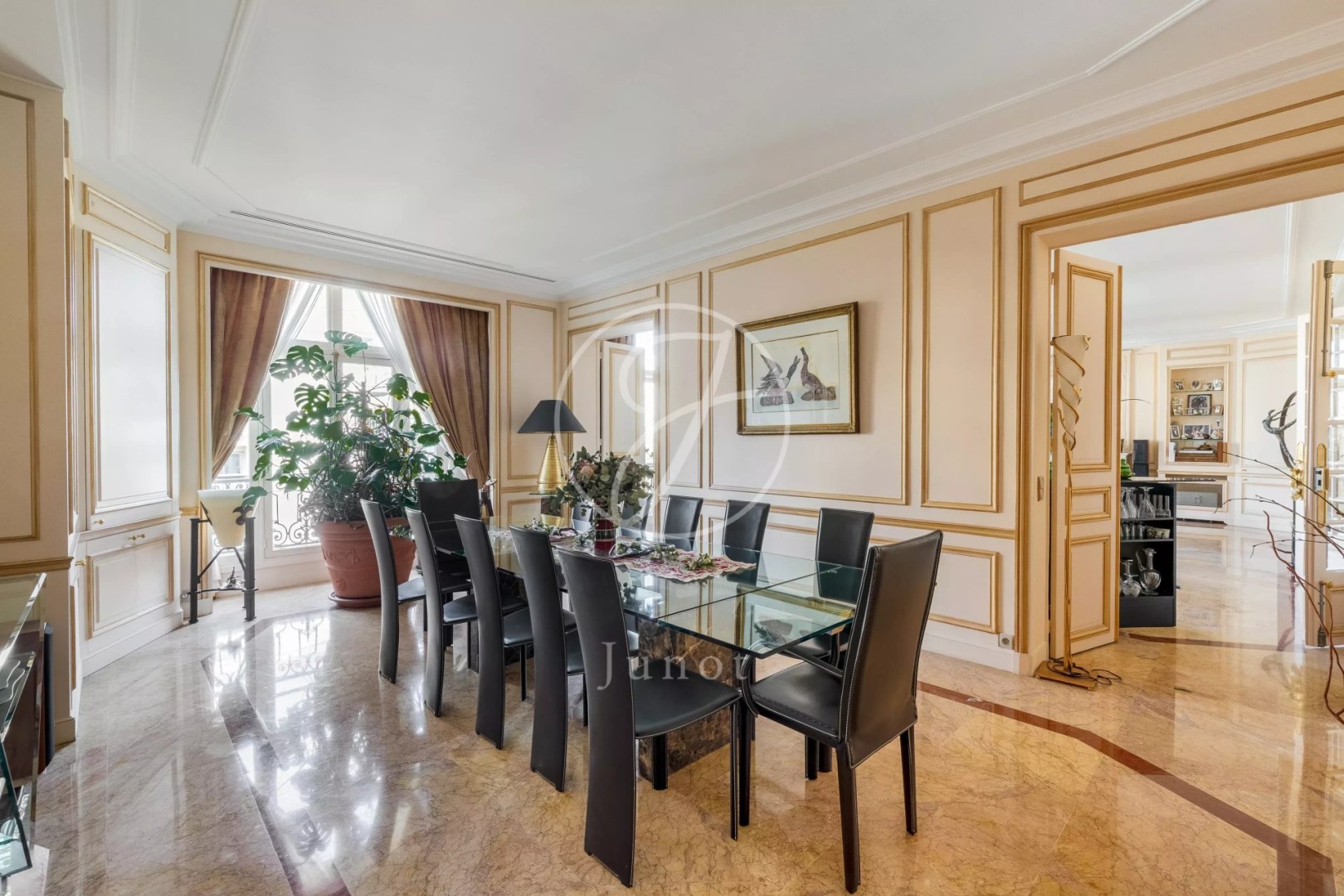 On the fourth floor by elevator of an elegant 1905 freestone building, this 252.07sqm loi Carrez family and reception apartment boasts magnificent volumes in a preserved Haussmann spirit. From the entrance, a majestic gallery distributes the spaces and creates a remarkable perspective. The living room, measuring over 50sqm, opens out onto the boulevard and enjoys an unobstructed, green view, offering constant luminosity. Mouldings, fireplaces, carefully decorated original marble and high ceilings underline the authentic character of the property. An adjoining dining room extends the receptions. The separate 26.79sqm kitchen provides a comfortable and functional dining area. The perfectly separate night space comprises three bedrooms, two of which have private shower rooms, and a master suite with bathroom and dressing room. Circulation is fluid and the layout particularly well-balanced. Two guest toilets complete the layout. With its open-plan layout, light and spacious rooms, this apartment will seduce you with its original cachet, its sought-after address and its open views over its wooded surroundings. A property with character in the heart of the 16th arrondissement, within easy reach of shops, transport and renowned schools.