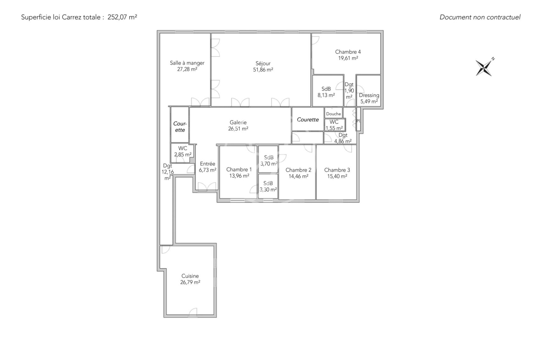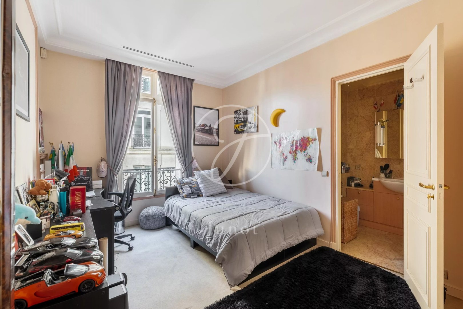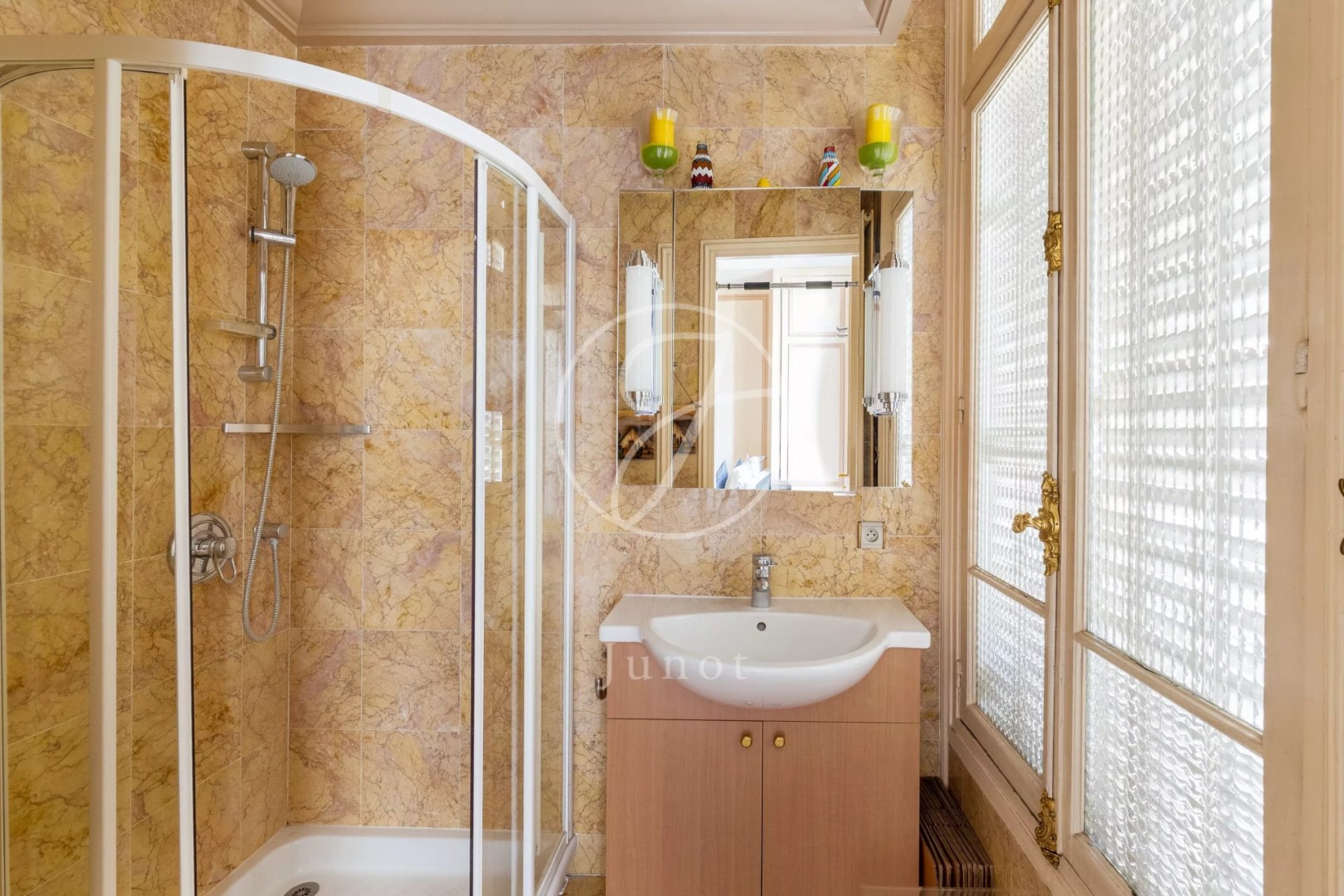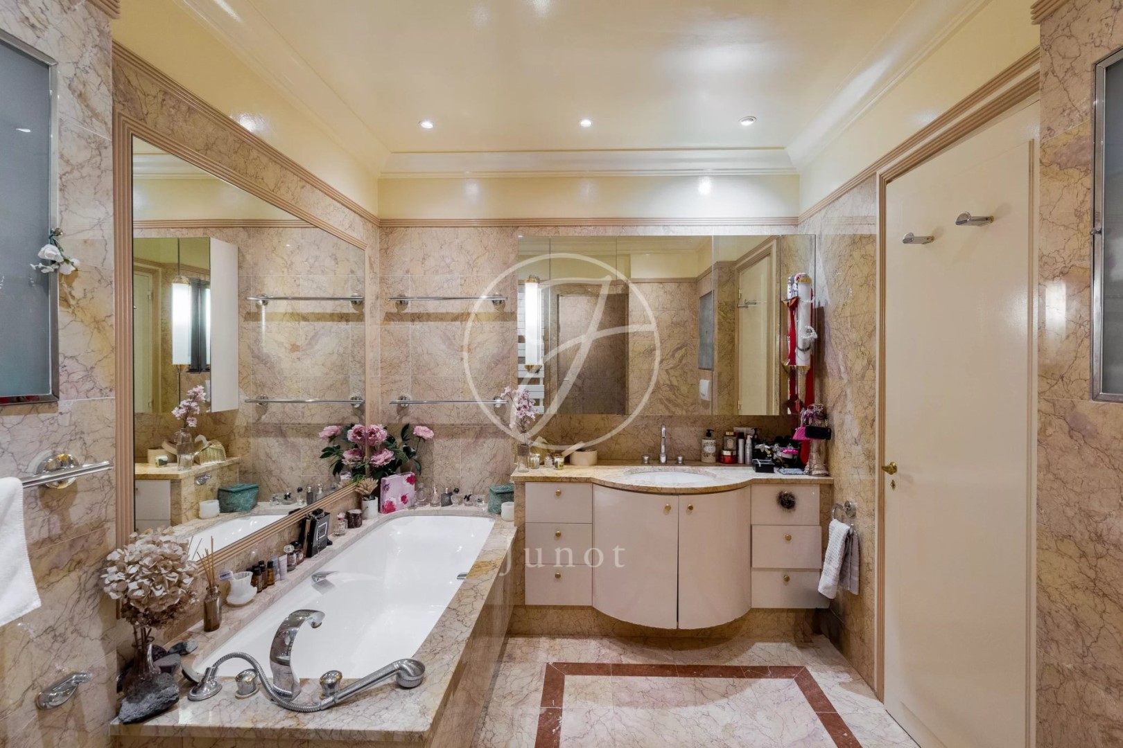On the fourth floor by elevator of an elegant 1905 freestone building, this 252.07sqm loi Carrez family and reception apartment boasts magnificent volumes in a preserved Haussmann spirit. From the entrance, a majestic gallery distributes the spaces and creates a remarkable perspective. The living room, measuring over 50sqm, opens out onto the boulevard and enjoys an unobstructed, green view, offering constant luminosity. Mouldings, fireplaces, carefully decorated original marble and high ceilings underline the authentic character of the property. An adjoining dining room extends the receptions. The separate 26.79sqm kitchen provides a comfortable and functional dining area. The perfectly separate night space comprises three bedrooms, two of which have private shower rooms, and a master suite with bathroom and dressing room. Circulation is fluid and the layout particularly well-balanced. Two guest toilets complete the layout. With its open-plan layout, light and spacious rooms, this apartment will seduce you with its original cachet, its sought-after address and its open views over its wooded surroundings. A property with character in the heart of the 16th arrondissement, within easy reach of shops, transport and renowned schools.